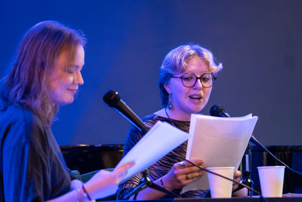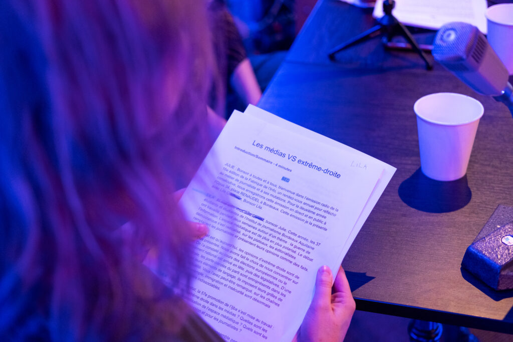 Orianne Gendreau, co-rédactrice en cheffe de la 16ème édition de La Fabrique de l’Info, prend le micro pour cadrer l’émission et parler de nos réflexions